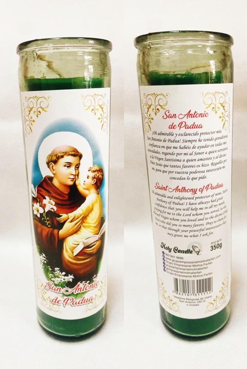 Veladora Religiosa Holy Candle 350 g. San Antonio de Padua color blanco, amarillo, azul, rojo, verde, naranja, lila, rosado.